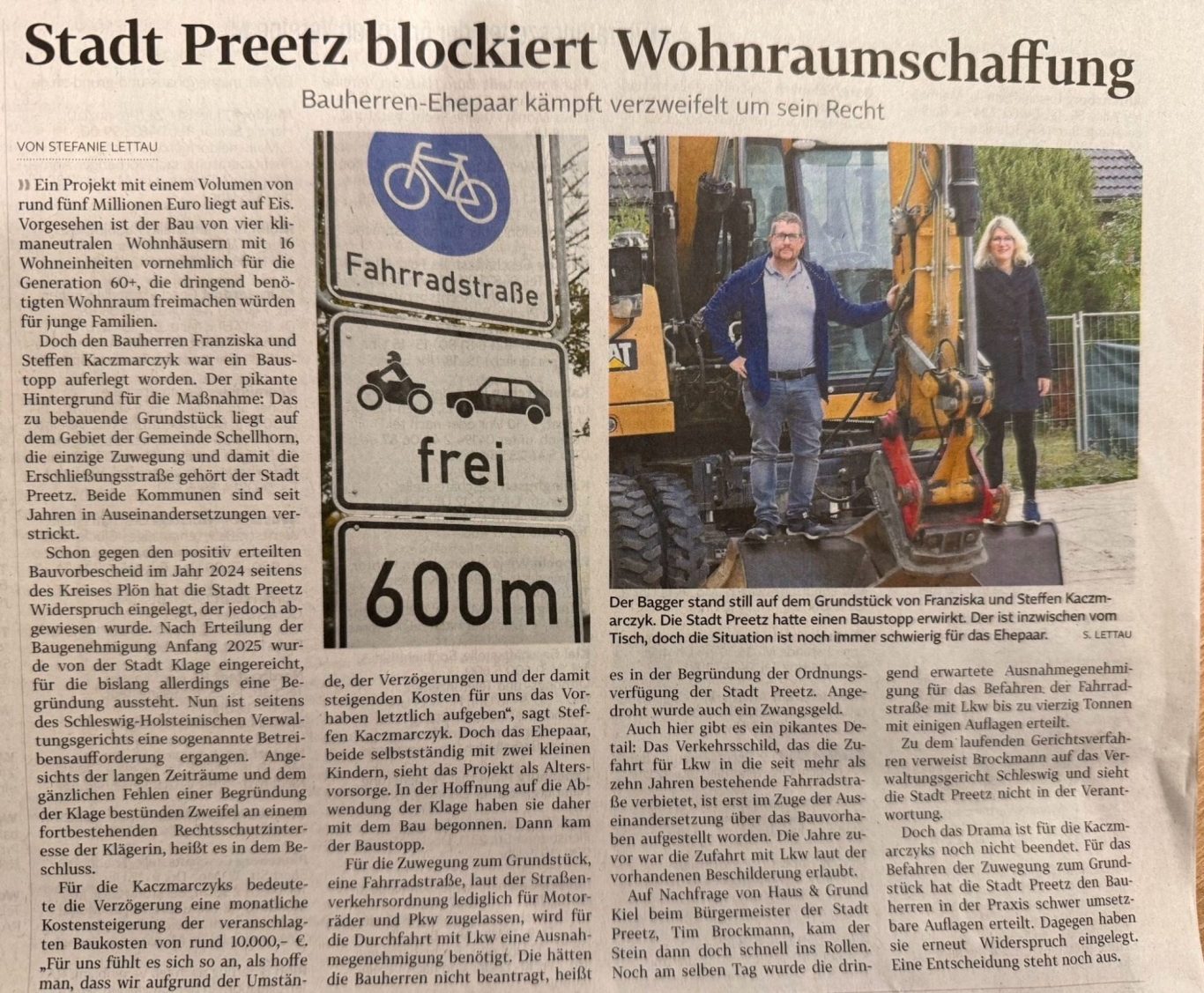 Schon gegen den positiv erteilten Bauvorbescheid im Jahr 2024 seitens des Kreises Plön hat die Stadt Preetz Widerspruch eingelegt, der jedoch abgewiesen wurde. Die daraufhin eingereichte Klage wurde seit Oktober 2024 nicht vor dem Verwaltungsgericht begründet.